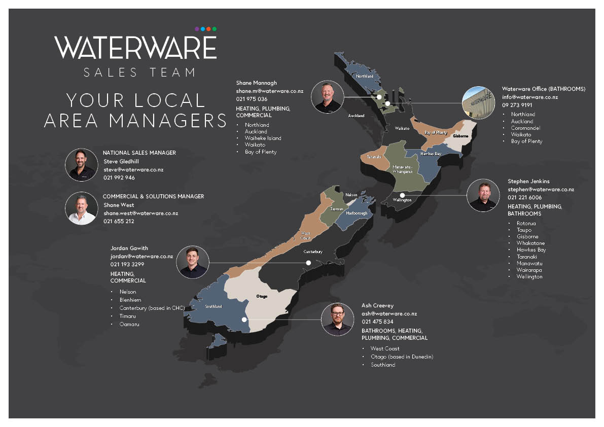 At Waterware, we believe local knowledge leads to smarter solutions. Our dedicated team of Area Sales Managers covers every corner of New Zealand — from Northland to Southland — with specialists in heating, plumbing, bathrooms, and commercial solutions.
